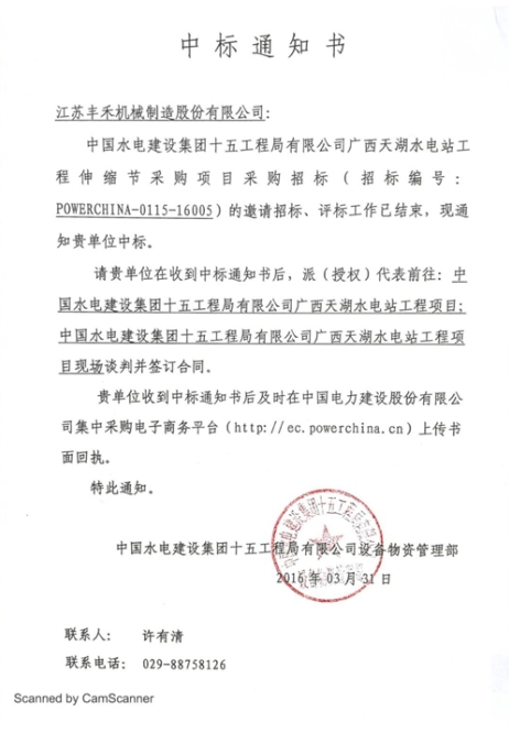 熱烈祝賀江蘇豐禾機械制造股份有限公司成功中標亞洲第一高水頭廣西天湖水電站二期擴建工程壓力鋼管伸縮節(jié)。