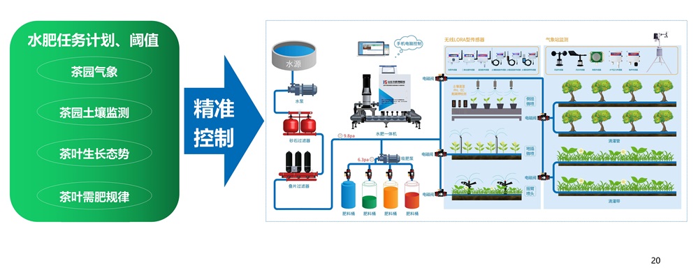 水肥一體化智慧灌溉 以最低的施肥成本獲得更好的茶葉品質(zhì)和更高的經(jīng)濟(jì)效益,將灌溉與施肥融為一體,借助壓力灌溉系統(tǒng),將可溶性固體或液體肥料,按照土壤養(yǎng)分含量及茶樹的需肥規(guī)律、需肥特點(diǎn),配兌成的肥液與灌溉水一起,準(zhǔn)確地輸送到茶樹根部土壤,滿足茶樹生長(zhǎng)所需。 無人機(jī)植保飛防 植保無人機(jī)統(tǒng)防統(tǒng)治作業(yè)效率高、應(yīng)用場(chǎng)景廣,有效提高茶園生產(chǎn)效率,降低茶園生產(chǎn)成本。 專業(yè)人員遠(yuǎn)程診斷服務(wù) 專業(yè)人員遠(yuǎn)程診斷服務(wù)系統(tǒng)采用無線傳輸技術(shù)、網(wǎng)絡(luò)視頻壓縮技術(shù),將視頻信息、控制信息、環(huán)境監(jiān)測(cè)等監(jiān)控?cái)?shù)據(jù)進(jìn)行壓縮編碼,通過無線數(shù)據(jù)網(wǎng)絡(luò)傳給專家,實(shí)現(xiàn)專家足不出戶,即可遠(yuǎn)程實(shí)時(shí)指導(dǎo)、瀏覽和在線答疑、咨詢等服務(wù)。
