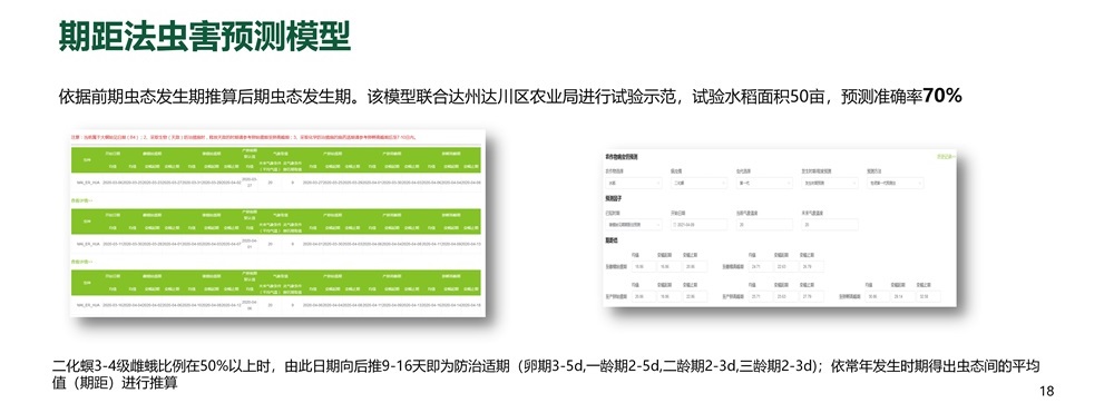 依據(jù)昆蟲各蟲態(tài)或全世代的發(fā)育起點(diǎn)溫度(t)、有效積溫(K),結(jié)合氣象預(yù)報(bào)溫度(T),由有效積溫公式,計(jì)算卵和幼蟲等蟲態(tài)發(fā)生歷期(d),d=K/(T-t)。模型與實(shí)際蟲害爆發(fā)趨勢(shì)一致性準(zhǔn)確率達(dá)85%