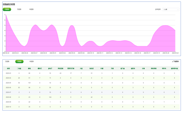歷史數(shù)據(jù)可按曲線、報表形式展現(xiàn),清晰直觀查看所有監(jiān)測設(shè)備的蟲情數(shù)據(jù)。