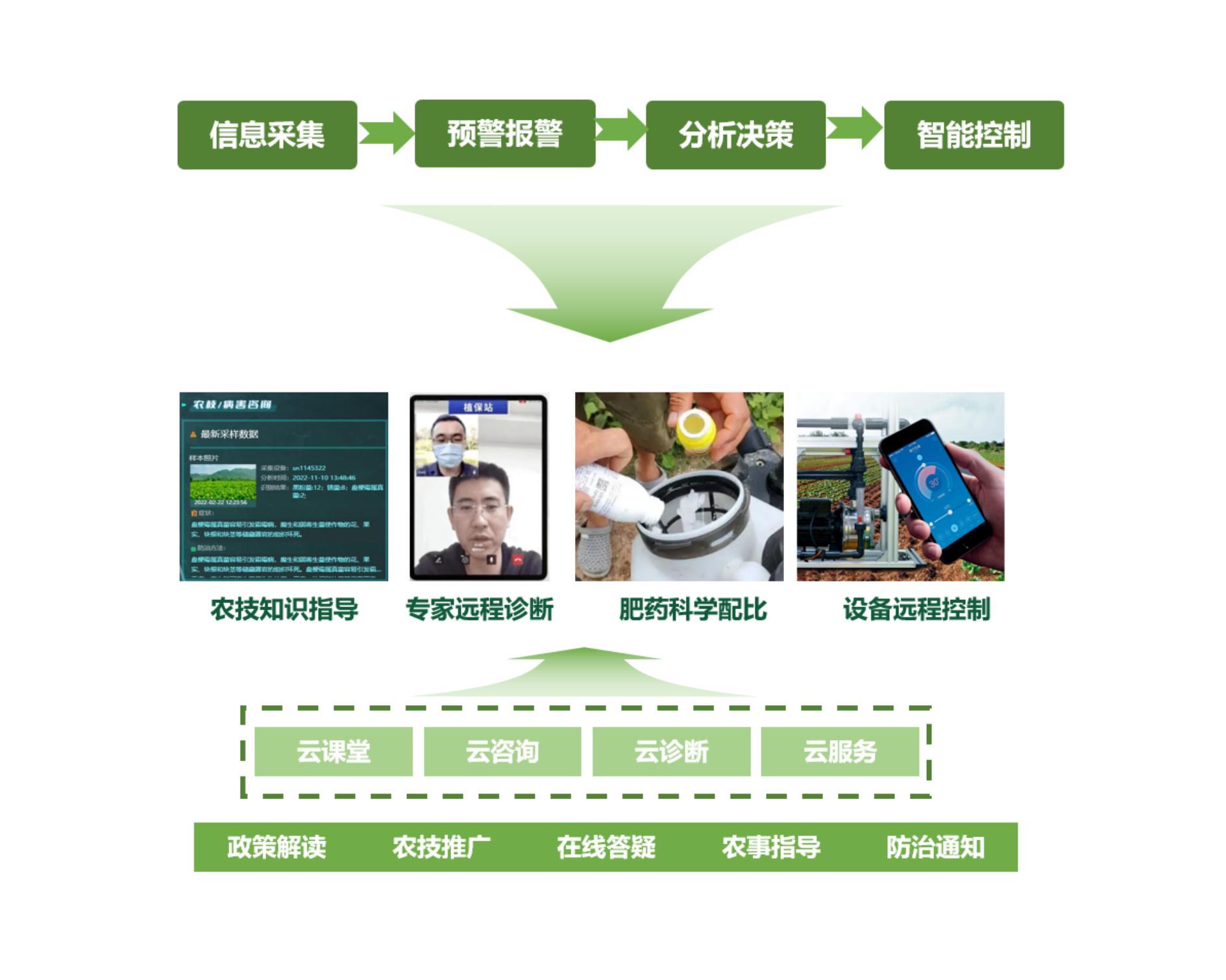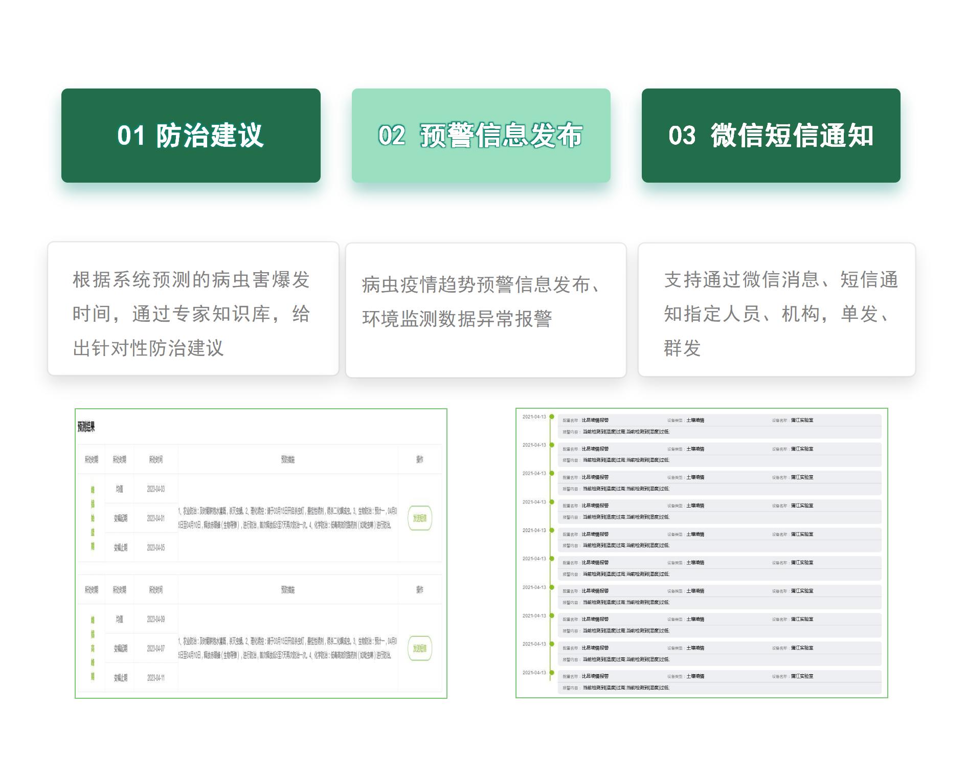 病蟲害智能監(jiān)測平臺綜合應(yīng)用 物聯(lián)網(wǎng)、人工智能技術(shù) ,通過監(jiān)測作物生長環(huán)境氣象數(shù)據(jù)、病蟲害圖像等,結(jié)合蟲害、病害的發(fā)生規(guī)律,進(jìn)行 蟲害病害分析識別和預(yù)警訓(xùn)練 ,提供病蟲害類型和發(fā)生程度信息,指導(dǎo)用戶在作物的每個(gè)生長階段做 最有效防范措施 。
