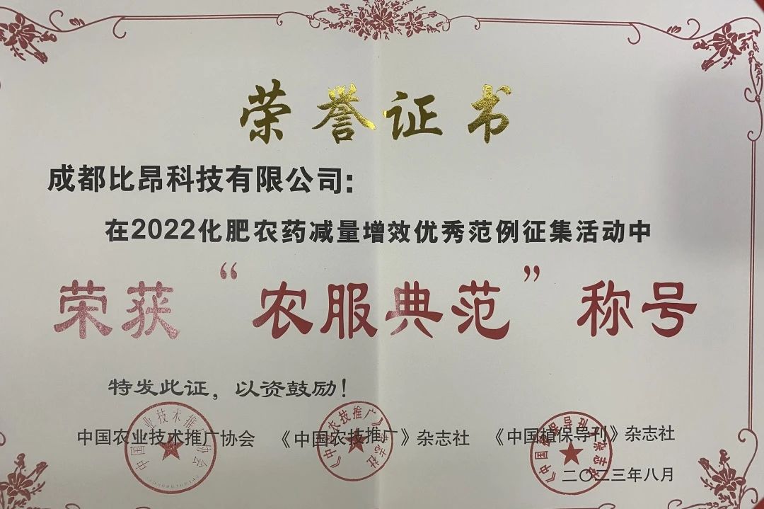 比昂科技以“農(nóng)業(yè)實(shí)現(xiàn)智慧管理、農(nóng)產(chǎn)品沒有農(nóng)殘威脅”為使命,在2022年化肥農(nóng)藥減量增效優(yōu)秀范例征集活動(dòng)中榮獲全國“農(nóng)服典范”稱號(hào),比昂科技董事長周倫榮獲“雙減之星”榮譽(yù)稱號(hào)。