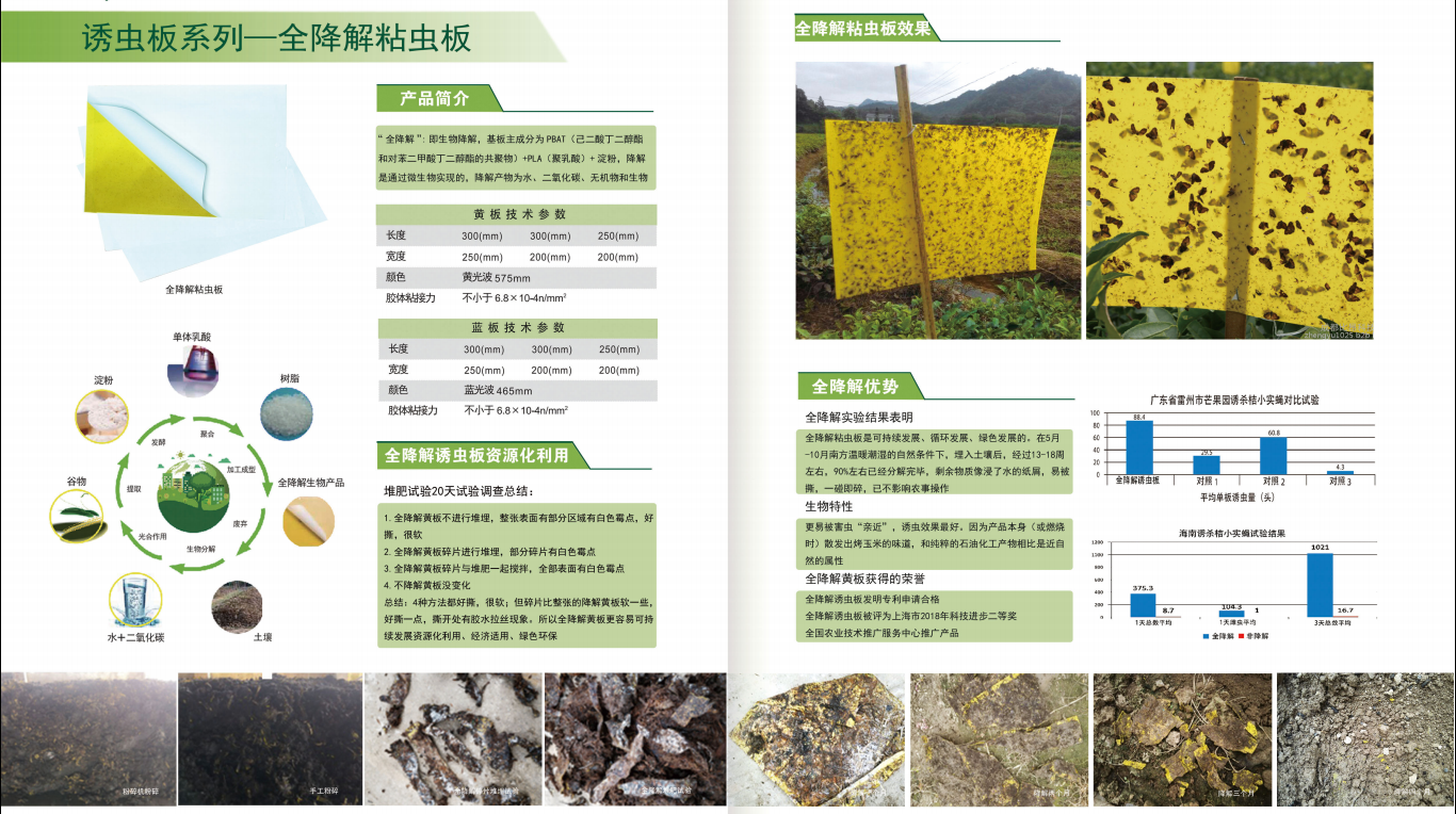 全降解誘蟲板由玉米淀粉等生物材質制成的誘蟲板基材,綠色環(huán)保,使用完畢后降解為生物肥,重新進入生態(tài)循環(huán)。